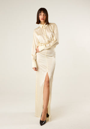 Abito lungo in look doppiato con parte superiore a camicia, colletto classico, maniche lunghe, parte inferiore con spacco profondo, chiusura laterale con zip