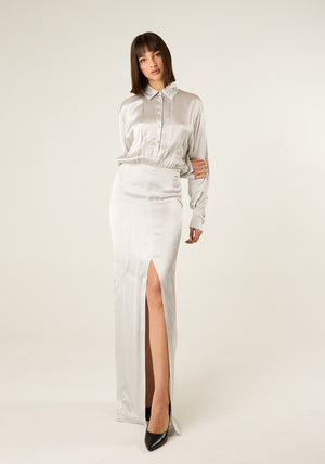 Abito lungo in look doppiato con parte superiore a camicia, colletto classico, maniche lunghe, parte inferiore con spacco profondo, chiusura laterale con zip