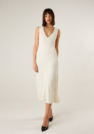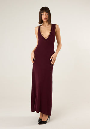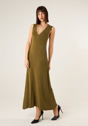 Abito lungo in maglia con scollo a V profilato lurex, giromanica, taglio dritto