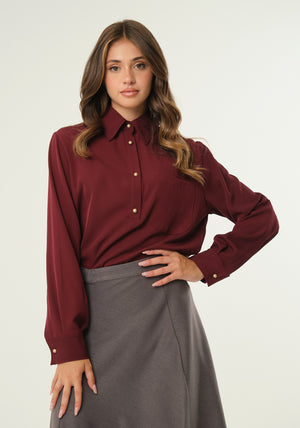 Camicia in tessuto scivolato con tasca laterale, colletto classico, maniche lunghe, chiusura frontale con bottoni ad effetto invecchiato