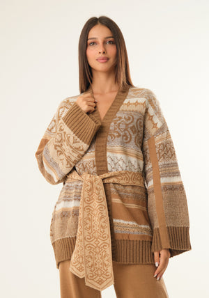 Cardigan fantasia a taglio over con cintura coordinata removibile