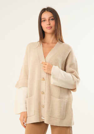 Cardigan in pura lana con tasche laterali, maniche lunghe a blocco di colore, chiusura frontale a V con bottoni logati