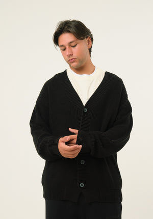 Cardigan in tricot con rotture, stampa posteriore, maniche lunghe, scollo a V, chiusura frontale con bottoni