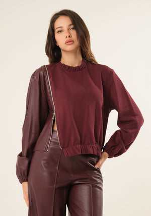 Felpa bi-tessuto con ampia zip laterale, dettagli con fascia elastica, scollo rotondo, maniche lunghe, interno garzato