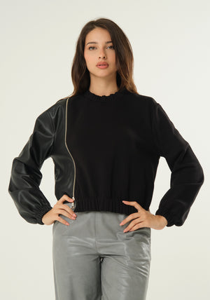 Felpa bi-tessuto con ampia zip laterale, dettagli con fascia elastica, scollo rotondo, maniche lunghe, interno garzato
