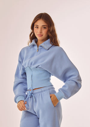 Felpa corta con corpetto in maglia elastica, maniche lunghe ampie, chiusura frontale con zip