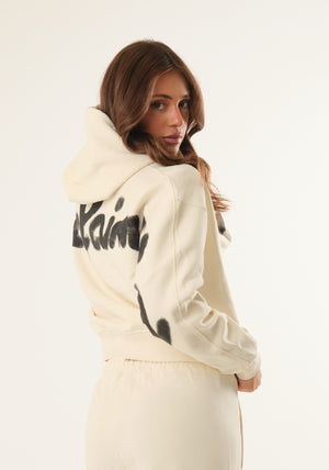 Felpa corta con stampa posteriore spray, cappuccio fisso con coulisse, maniche lunghe, dettagli in maglia elastica, interno garzato