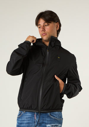 Giacca a vento natrata Farrin in nylon leggermente elasticizzata, sfoderata con cappuccio fisso. Chiusure con zip a contrasto di colore, elastico su polsini. Caratteristico passante Blauer cucito sul petto a sinistra e patch sulla manica sinistra entrambi con logo in contrasto colore