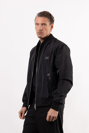Giubbino bomber in tessuto tecnico con placchetta logata, tasche laterali, chiusura frontale con zip, dettagli in maglia elastica