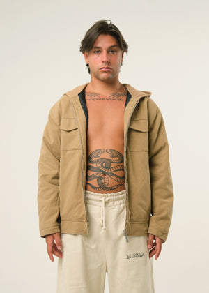 Giubbino in gabardine con stampa logata posteriore, cappuccio fisso, maniche lunghe, tasche laterali, chiusura frontale con zip