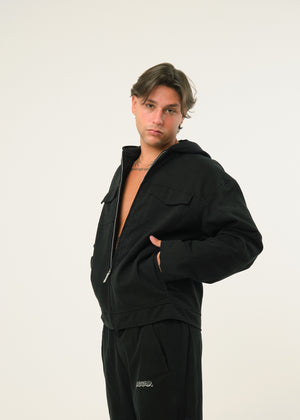 Giubbino in gabardine con stampa logata posteriore, cappuccio fisso, maniche lunghe, tasche laterali, chiusura frontale con zip