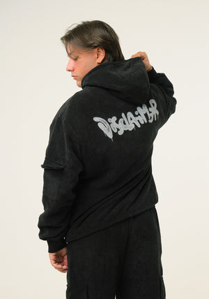 Giubbino in velluto a coste con cappuccio fisso con coulisse, stampa posteriore, maniche lunghe, tasche laterali, chiusura frontale con zip
