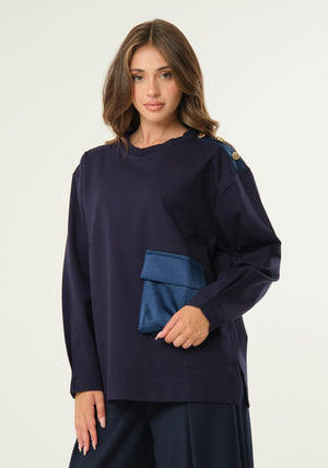 Maglia in punto milano con dettagli in raso e bottoni decorativi, tasca laterale, maniche lunghe con apertura, scollo rotondo, spacchi laterali su fondo