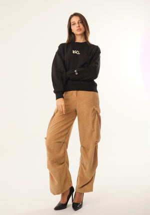 Pantalone arricciato in velluto a costine con tasche laterali, vita alta, chiusura con bottone e zip