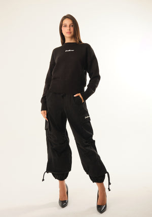 Pantalone cargo in gabardine con stampa laterale a contrasto di colore, caviglia con coulisse, vita elastica con coulisse