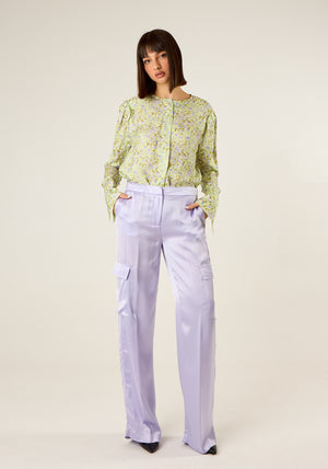 Pantalone cargo in raso a gamba dritta, tasche laterali, vita alta con chiusura frontale con gancio e zip nascosta