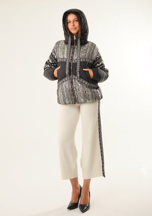 Pantalone con banda jacquard laterale in fantasia etnica gamba morbida, fascia elastica in vita. Vestibilità comoda