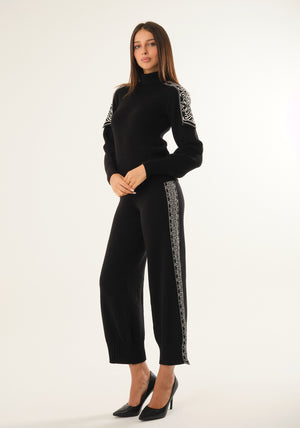Pantalone con banda jacquard laterale in fantasia etnica gamba morbida, fascia elastica in vita. Vestibilità comoda