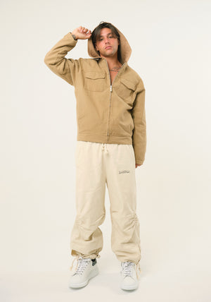 Pantalone in gabardine con arricci lungo gamba, fondo con coulisse, logo laterale, tasche laterali, vita elastica con coulisse