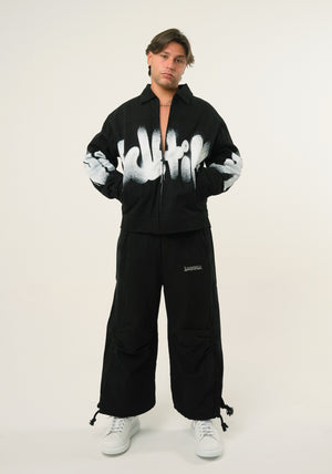 Pantalone in gabardine con arricci lungo gamba, fondo con coulisse, logo laterale, tasche laterali, vita elastica con coulisse