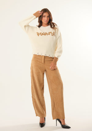 Pantalone in velluto a coste a vita alta, fettuccia laterale, taglio dritto, tasche laterali, chiusura frontale con bottone e zip