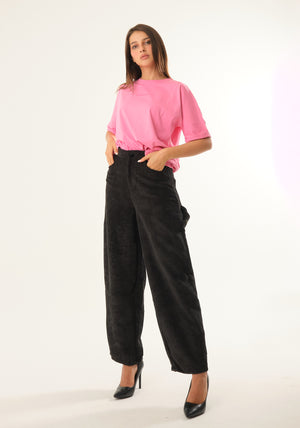 Pantalone in velluto a coste a vita alta, fettuccia laterale, taglio dritto, tasche laterali, chiusura frontale con bottone e zip