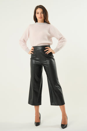 Pantalone palazzo 7/8 in ecopelle a vita alta, chiusura laterale con zip