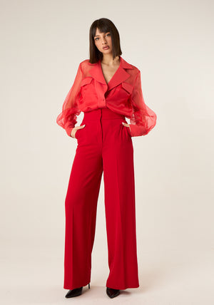 Pantalone palazzo a vita alta a taglio sartoriale, tasche laterali, chiusura frontale con ganci nascosti e zip