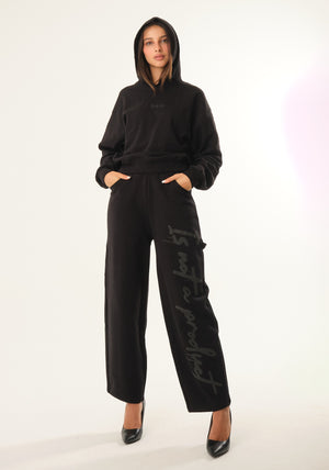 Pantalone palazzo con stampa in rilievo laterale, vita alta con fascia elastica in vita, tashce laterali, interno garzato