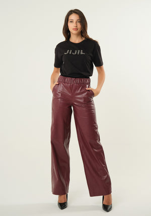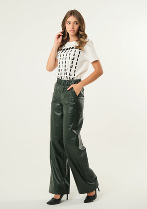 Pantalone palazzo in ecopelle con fascia elastica in vita, tasche a filetto laterali, cucitura decorativa a mezza gamba
