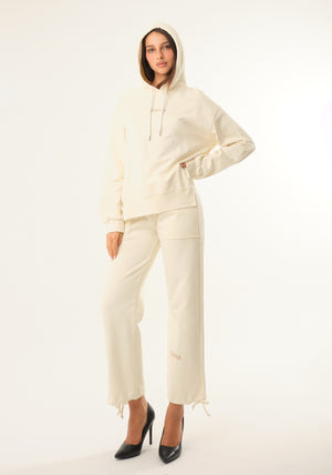 Pantalone palazzo in felpa con fondo regolabile, tasche laterale, fascia elastica in vita, interno garzato