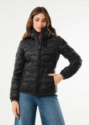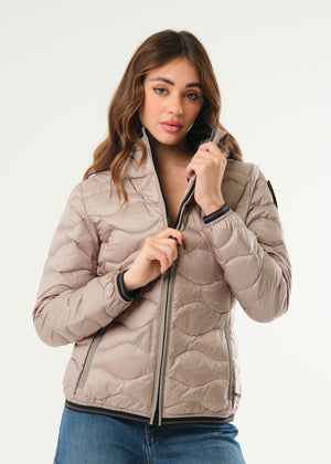 Piumino ad onde Camelia in nylon con imbottitura di piuma. Trapuntatura a onde con tasche laterali, chiusura con zip a doppio cursore centrale, passante logato frontale e patch logato con brillantini Swarovski removibile