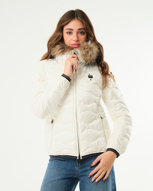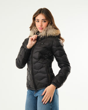 Piumino Aldie con bordo in pelliccia removibile tramite zip. In nylon con tasche laterali e chiusura centrale con zip a doppio cursore e elastico rigato su fondo e su polsini. Passante logato frontale e patch logato con brillantini Swarovski removibile.