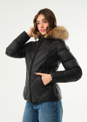 Piumino Alicia a linee geometriche in nylon con trapuntatura a linee geometriche con cappuccio fisso e bordo in pelliccia removibile tramite zip. Fodera interna a contrasto di colore, tasche laterali, chiusura con zip centrale a doppio cursore, passante logato frontale e patch logato.
