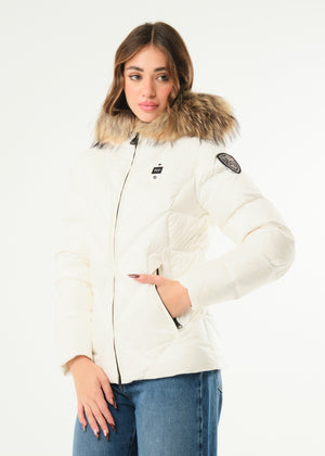 Piumino Alicia a linee geometriche in nylon con trapuntatura a linee geometriche con cappuccio fisso e bordo in pelliccia removibile tramite zip. Fodera interna a contrasto di colore, tasche laterali, chiusura con zip centrale a doppio cursore, passante logato frontale e patch logato.