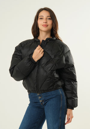 Piumino corto con colletto removibile e interno a contrasto di colore, maniche lunghe, fondo e polsino elastico, tasche laterali e chiusura frontale con zip