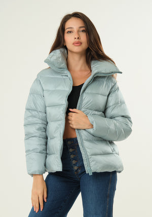 Piumino corto con collo ampio, trapuntatura classica orizzontale, maniche lunghe, tasche laterali, chiusura frontale con zip