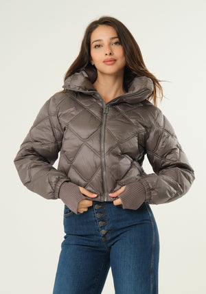 Piumino corto con polsino a guanto, con ampio collo imbottito, taglio comodo, tasche laterali, chiusura frontale con zip