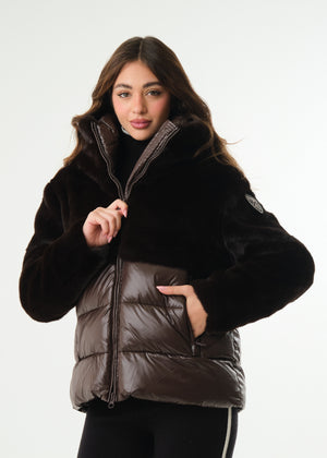 Piumino Fanevil con ecopelliccia e tessuto in nylon cangiante, tasche laterali, chiusura con zip e patta nascosta, passante logato frontale