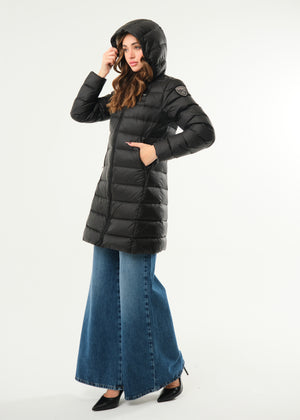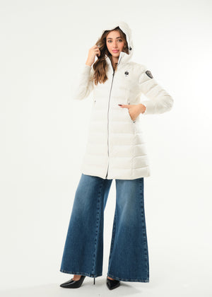 Piumino lungo Agnes a righe in nylon idrorepellente con interno a contrasto di colore. Trapuntatura orizzontale con tasche laterali, chiusura con zip a doppio cursore centrale, passante logato frontale e patch logato fisso