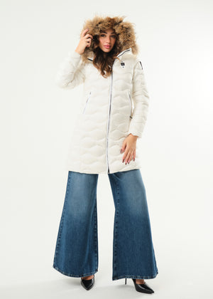 Piumino lungo Lynel ad onde con pelliccia ed interno a contrasto di colore, tasche laterali e chiusura centrale con zip a doppio cursore, passante logato frontale e patch logato.