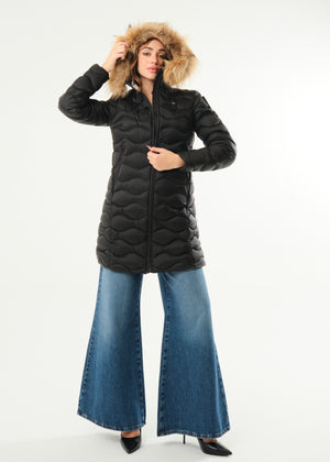 Piumino lungo Lynel ad onde con pelliccia ed interno a contrasto di colore, tasche laterali e chiusura centrale con zip a doppio cursore, passante logato frontale e patch logato.