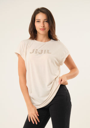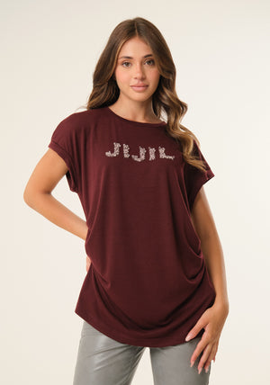 T-shirt in viscosa con applicazioni preziose, scollo rotondo, arricci laterali, maniche ad aletta con ampio giromanica