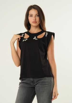 T-shirt smanicata con aperture a goccia frontali, applicazioni gioiello, scollo rotondo, taglio dritto, spalline interne