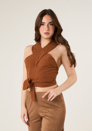 Top con allaccio al collo e schiena nuda, scollo a V frontale, revers a giacca, fusciacca da annodare in vita, chiusura al collo con bottoni in tinta