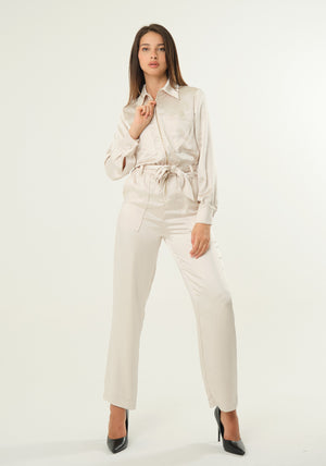 Tuta lunga in raso a gambe lunghe con vita elasticizzata con passanti, cintura coordinata removibile, tasconi frontali, colletto a camicia, chiusura ampia frontale con zip