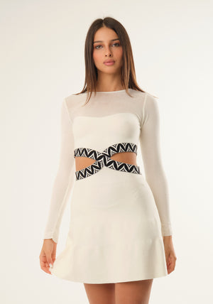 Abito corto a ruota con cut out laterali, maniche lunghe, scollo rotondo, parte superiore trasparente