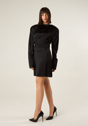 Abito corto accollato in raso a maniche lunghe con polsino lungo, vita fasciante, spalline interne, chiusura posteriore con bottone e zip laterale