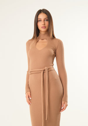 Abito lungo a costine a mezzo collo e apertura a goccia frontale, maniche lunghe, taglio dritto, cintura coordinata removibile
