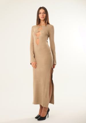 Abito lungo con apertura a goccia frontale con dettagli a bottoni, maniche lunghe, scollo rotondo, ampio spacco laterale